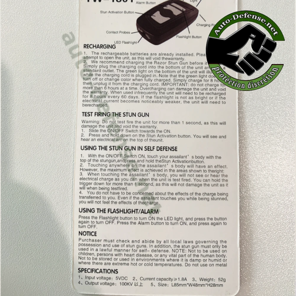 Ce taser multifonction avec lampe va au-delà de la simple défense. Équipé d’une lampe LED intégrée, il éclaire les zones sombres pour vous guider en toute sécurité. De plus, son alarme sonore 120 dB émet un son puissant pour dissuader une menace et alerter les personnes à proximité. Que ce soit pour une sortie nocturne ou une urgence, ce taser est votre allié idéal.
